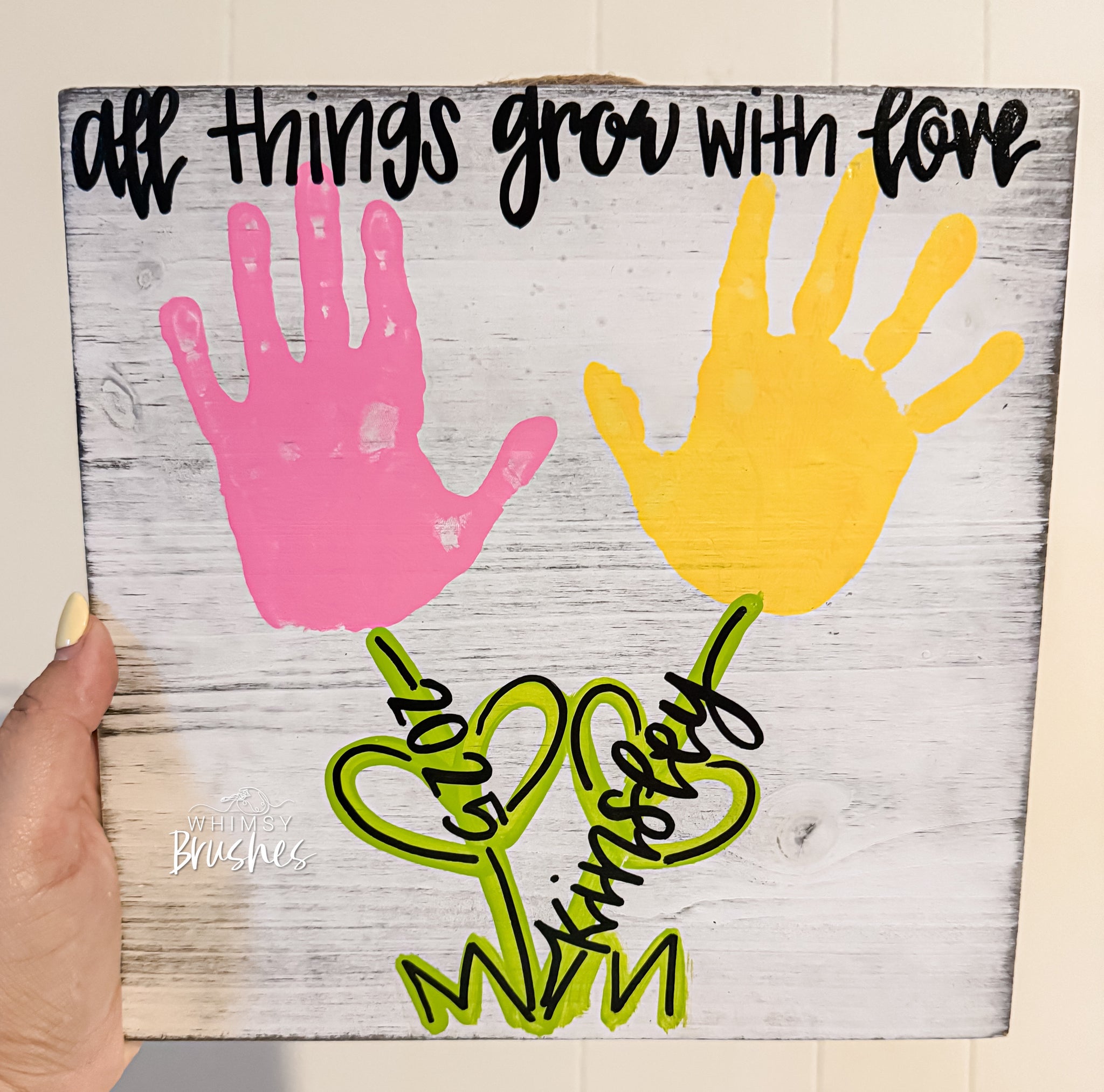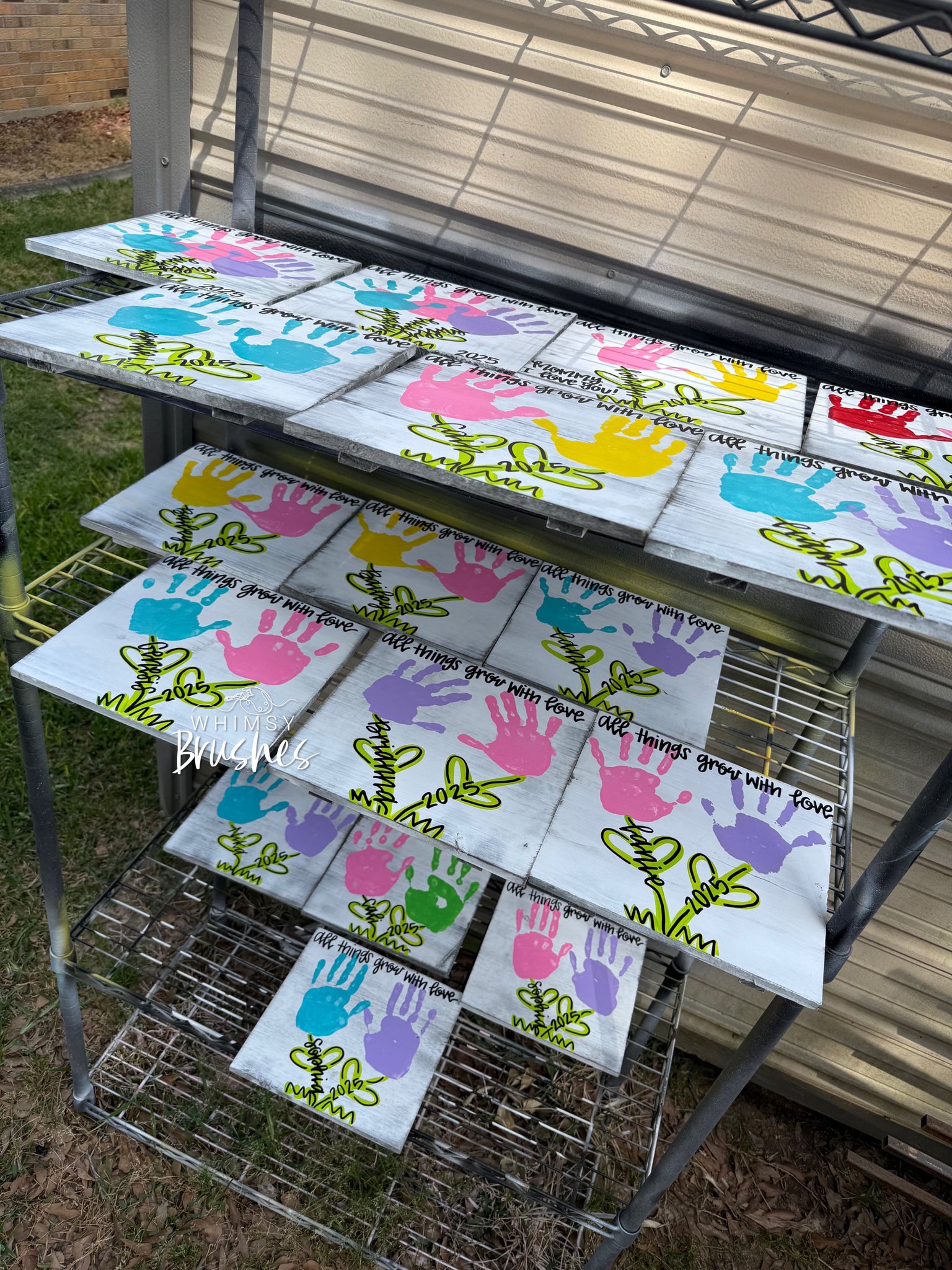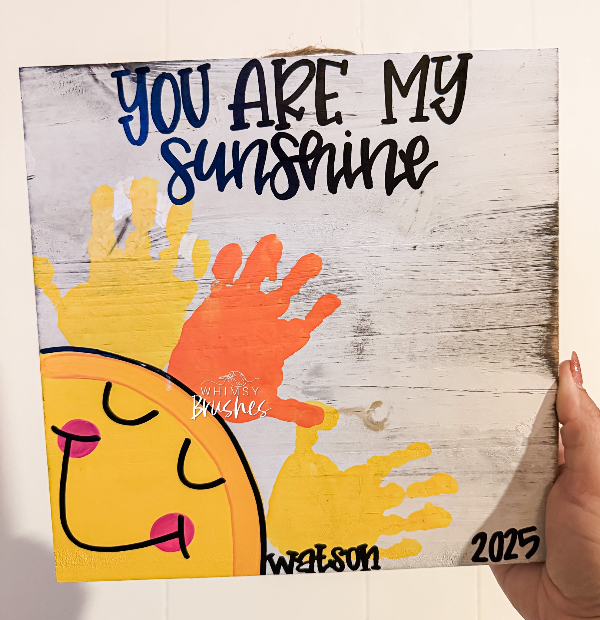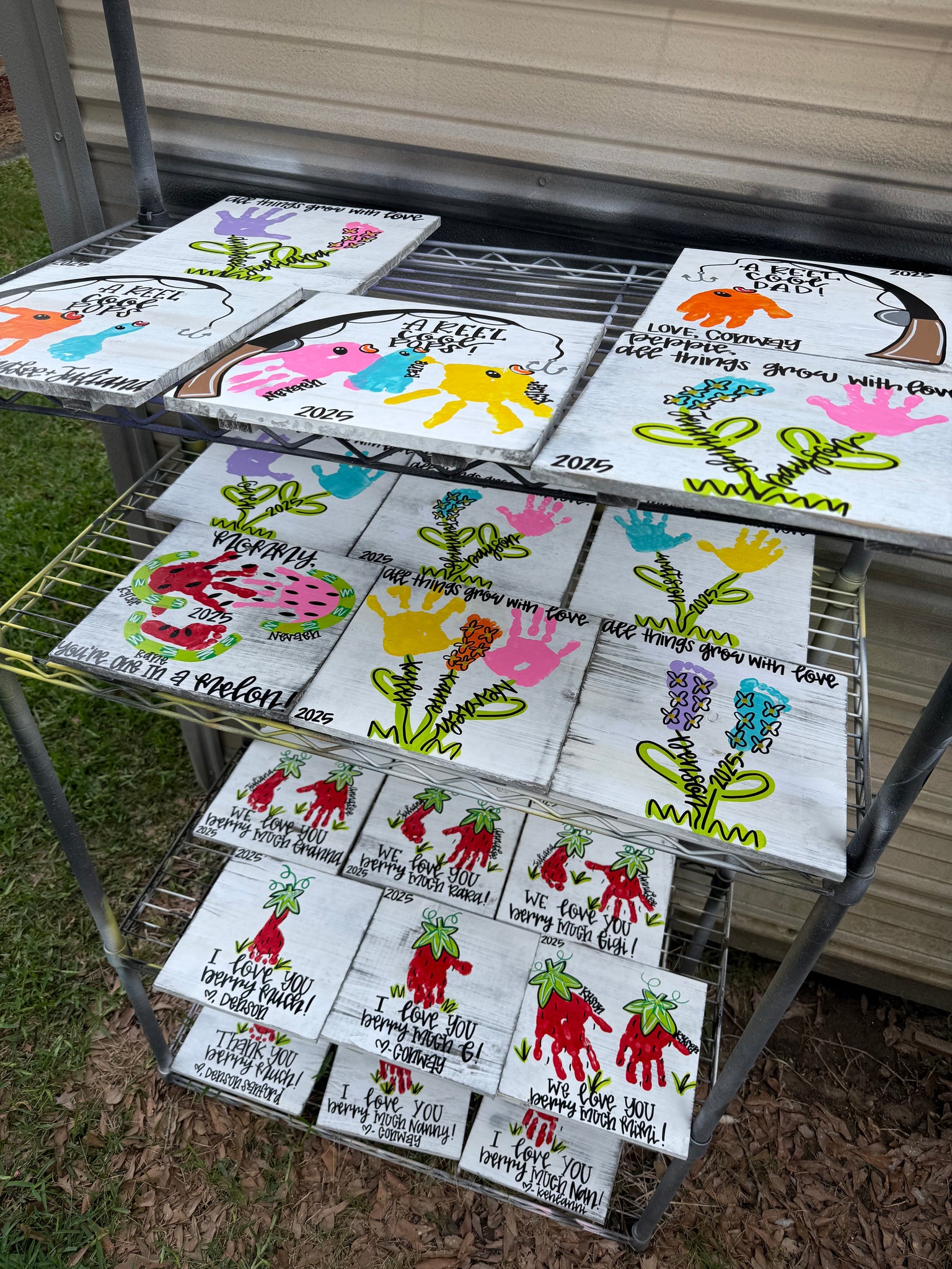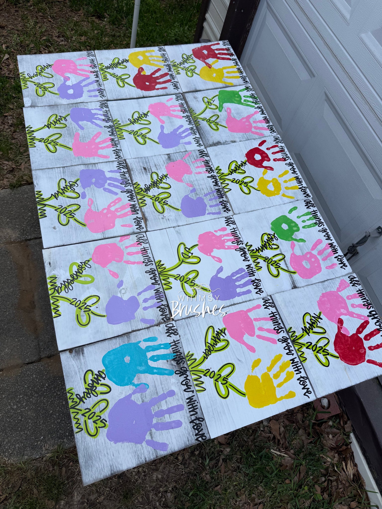10x10 distressed wooden plaque can be propped on a shelf, hung with the twine hanger, OR sawtooth picture hanger. Multiple handprints/footprints can be added to 1 plaque.