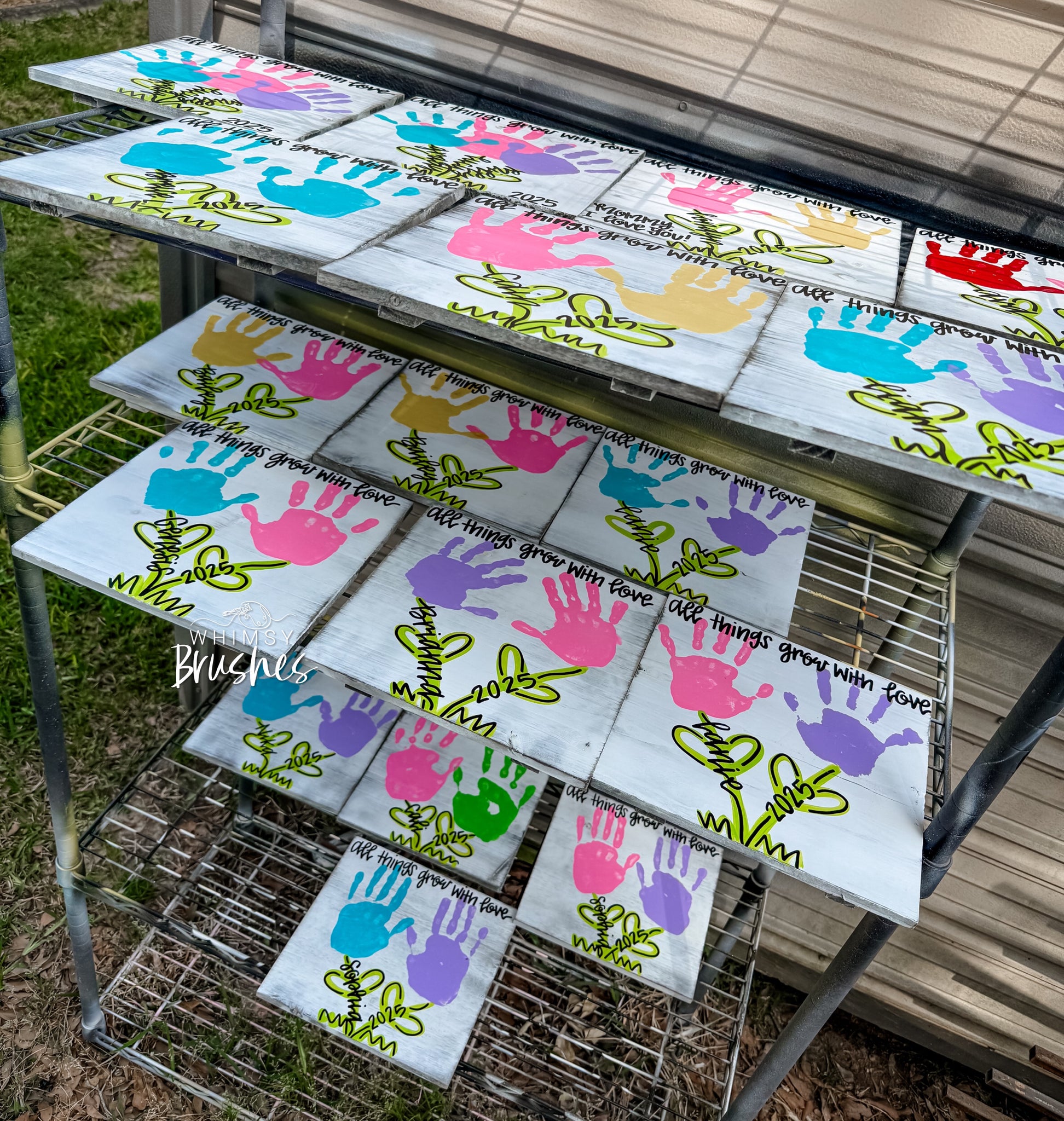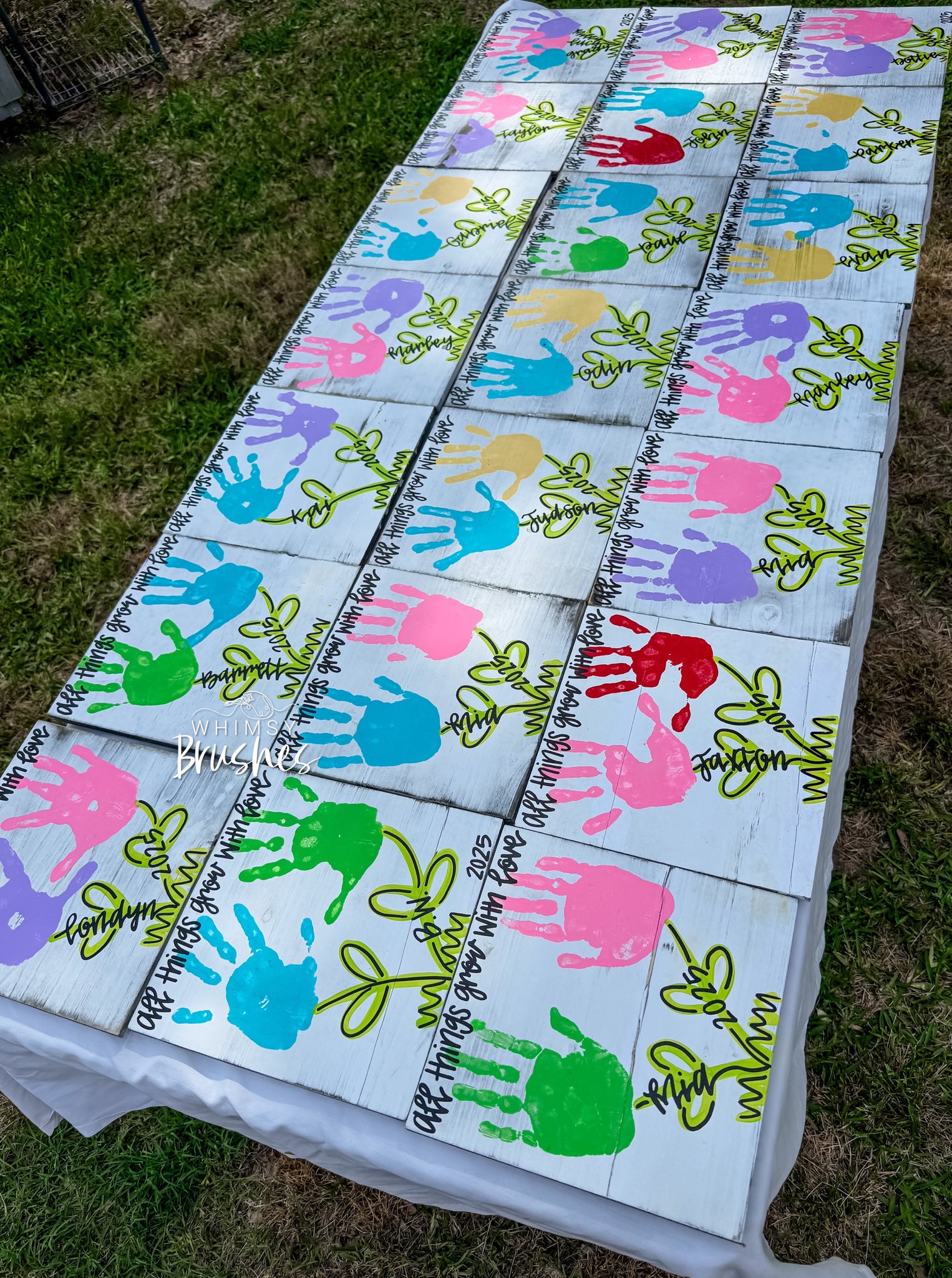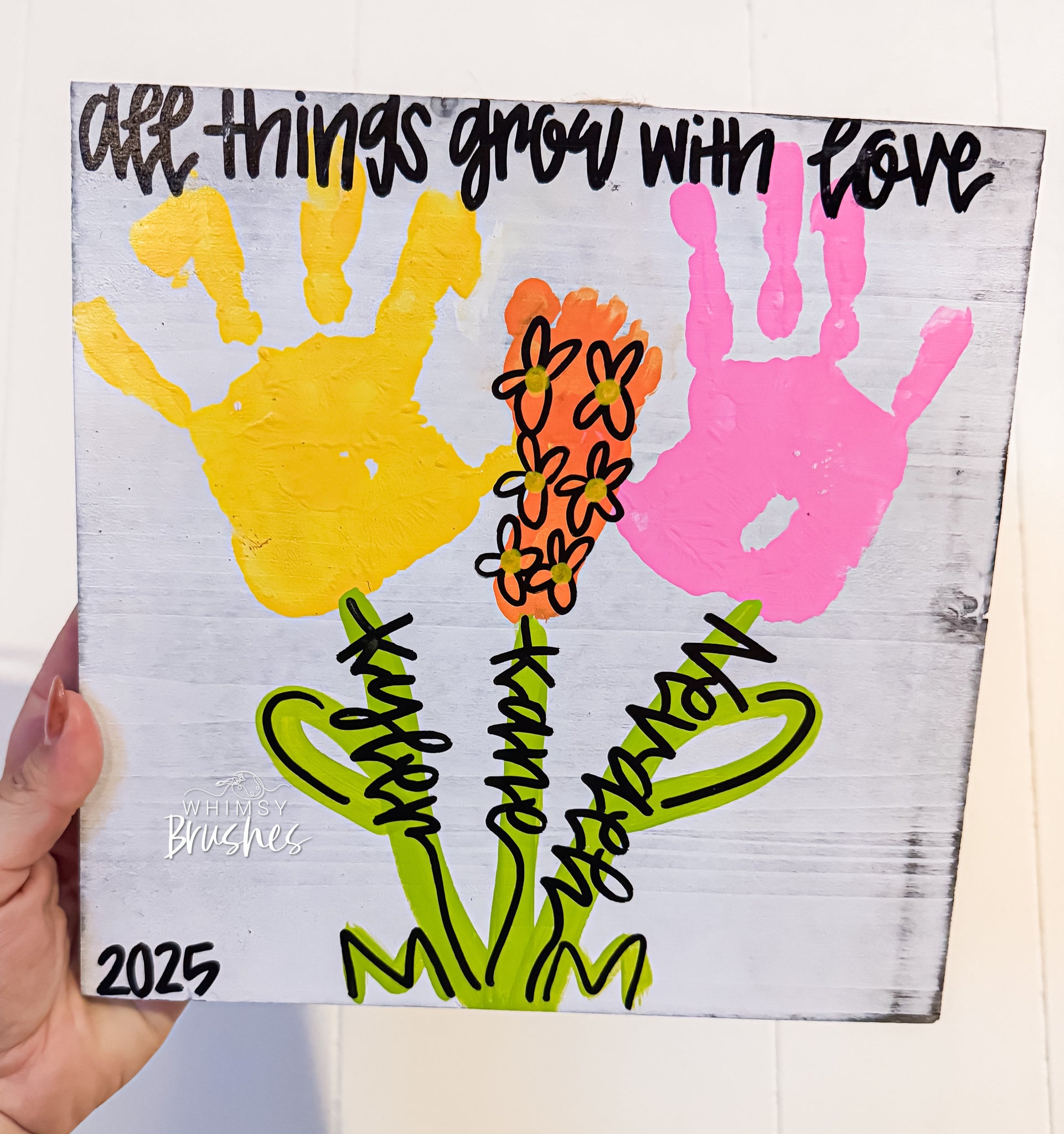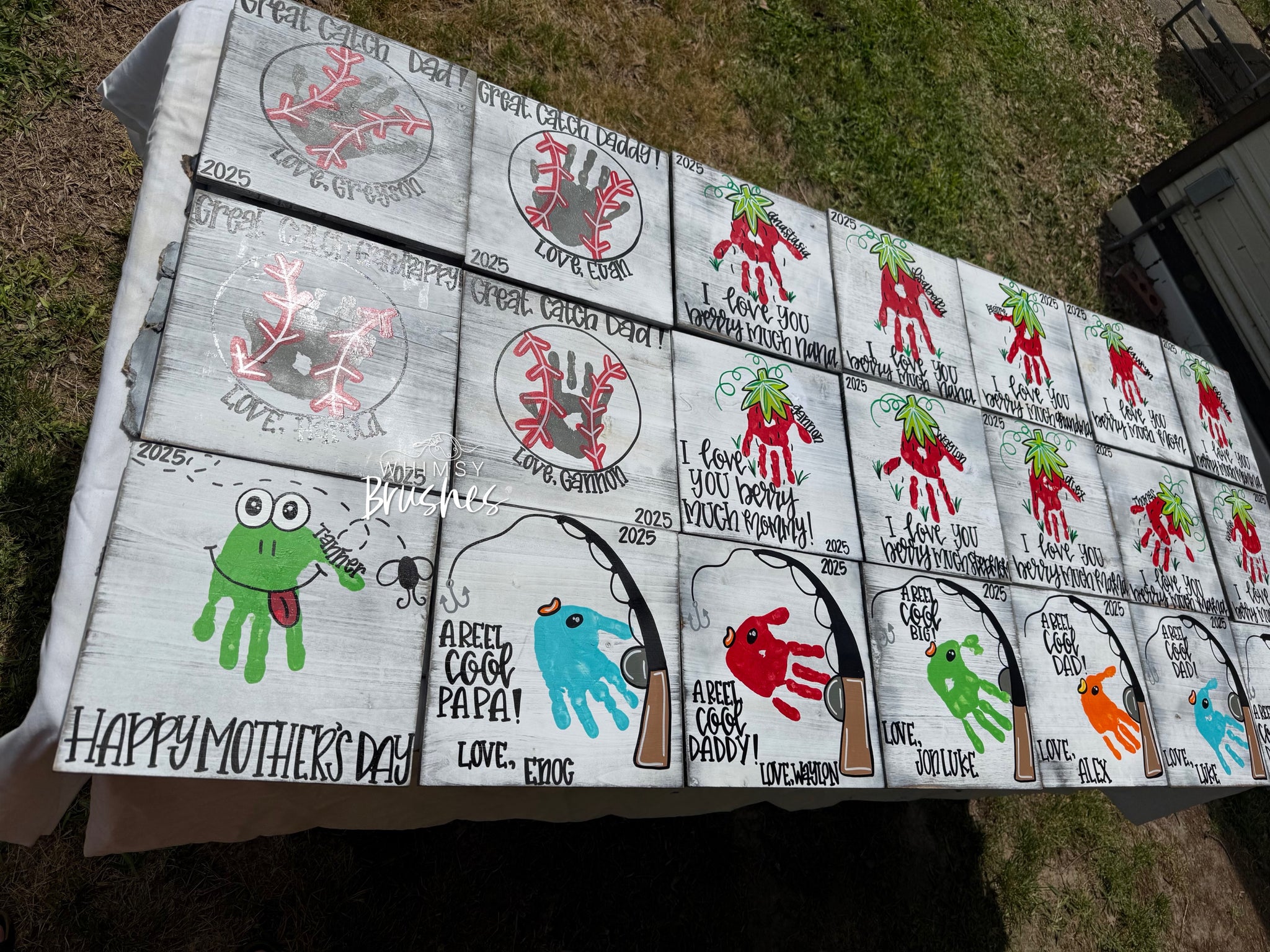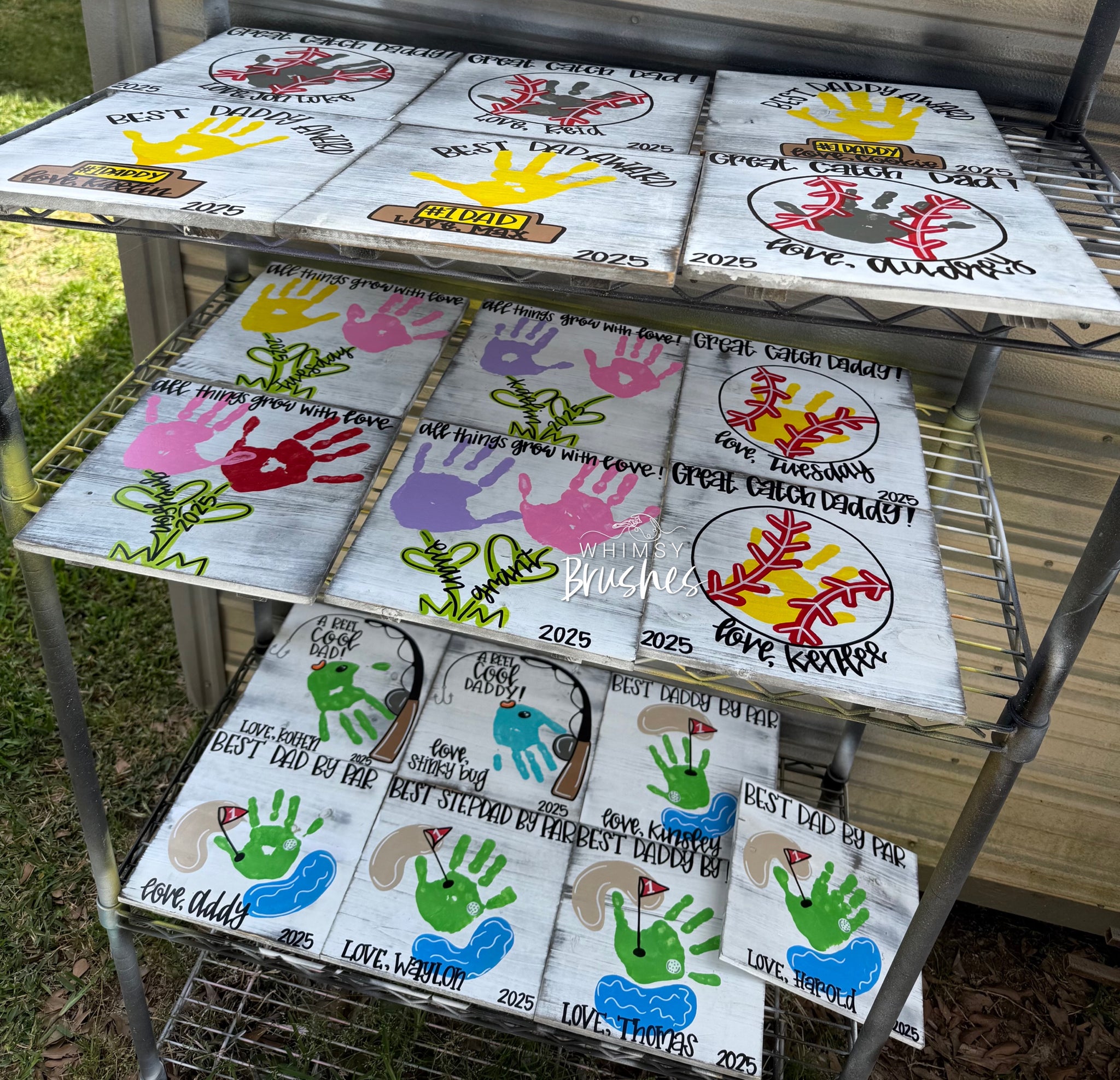10x10 distressed wooden plaque can be propped on a shelf, hung with the twine hanger, OR sawtooth picture hanger. Multiple handprints/footprints can be added to 1 plaque.