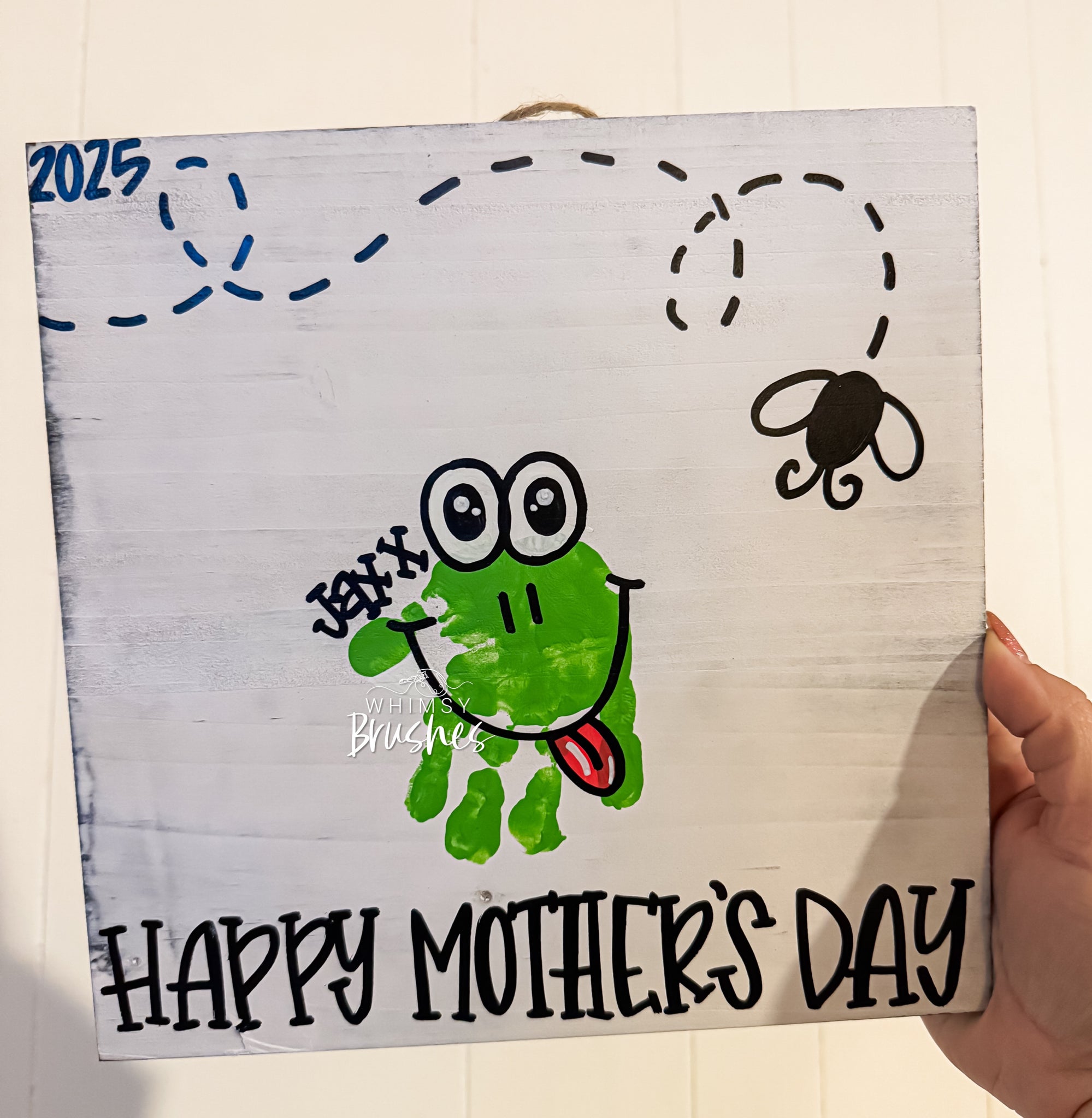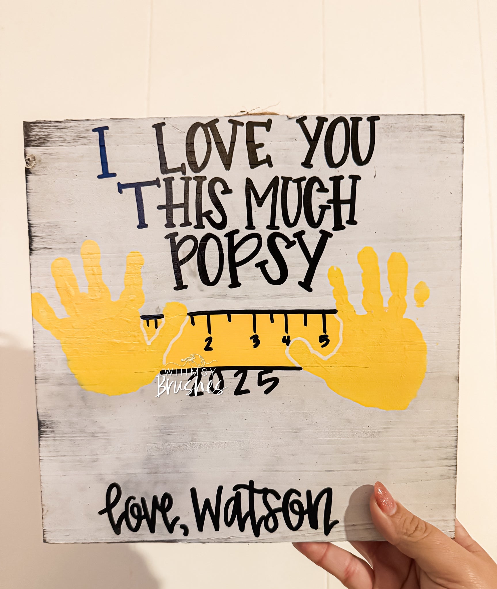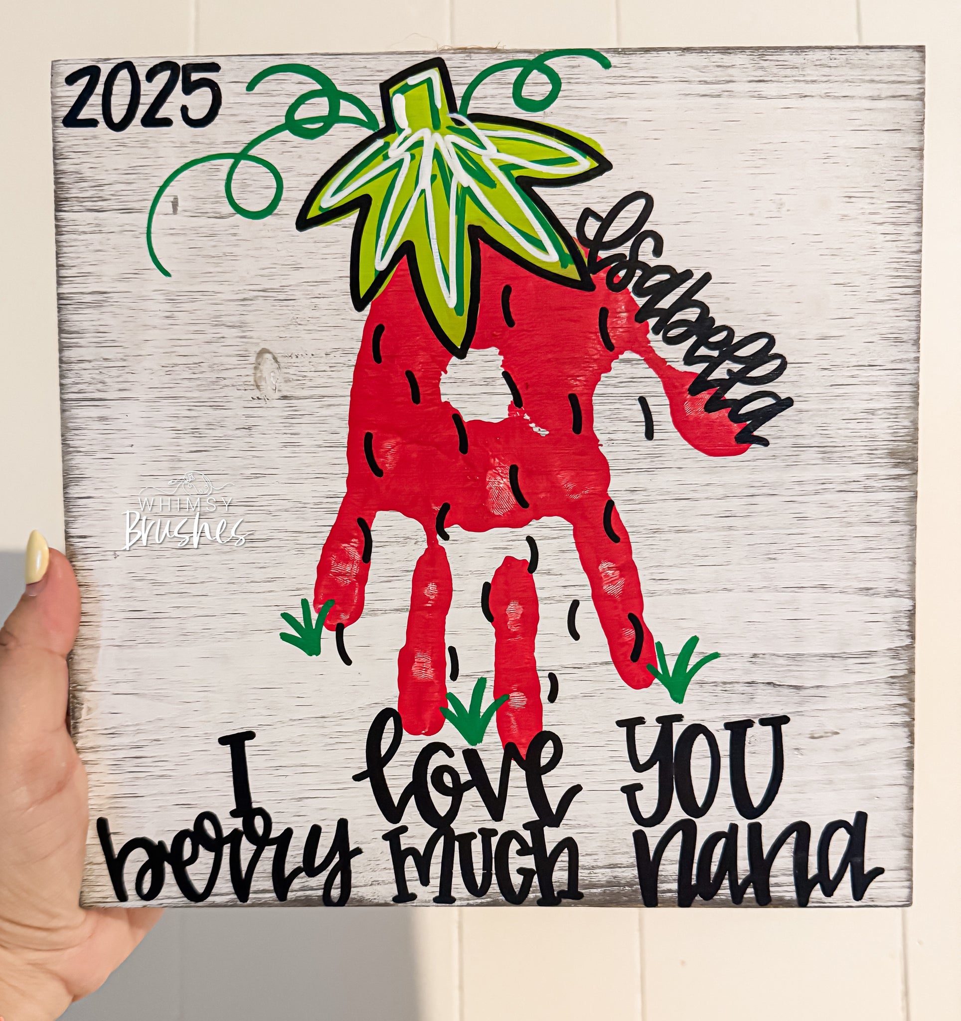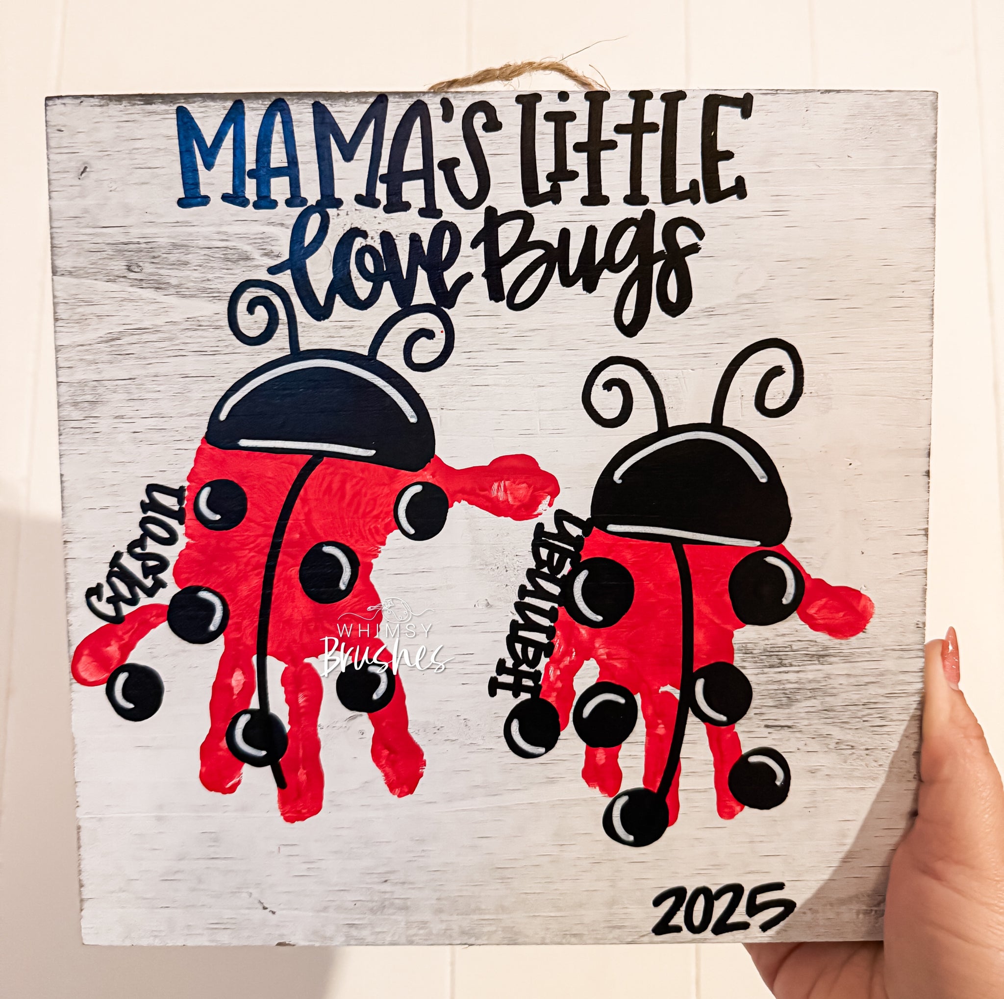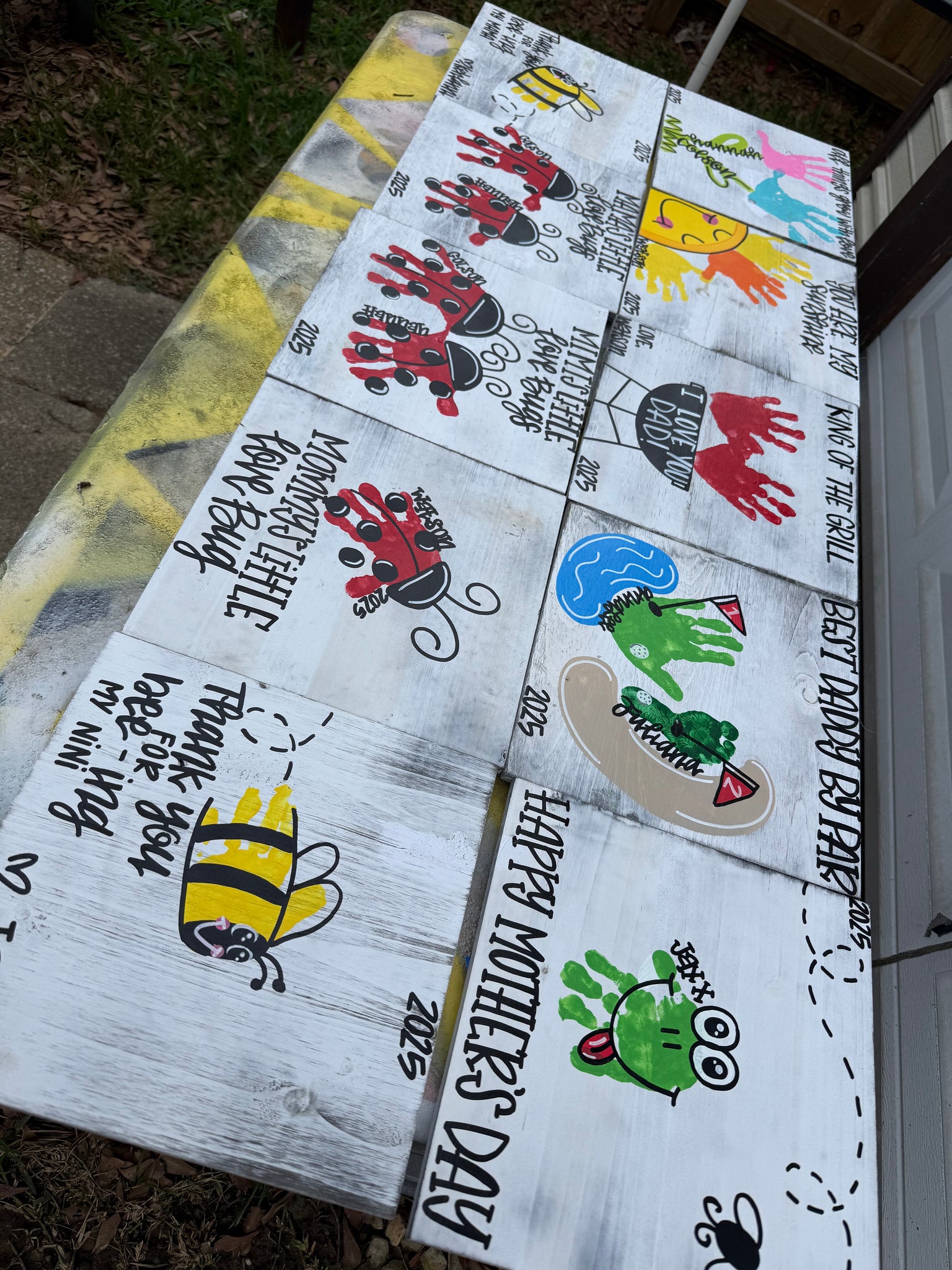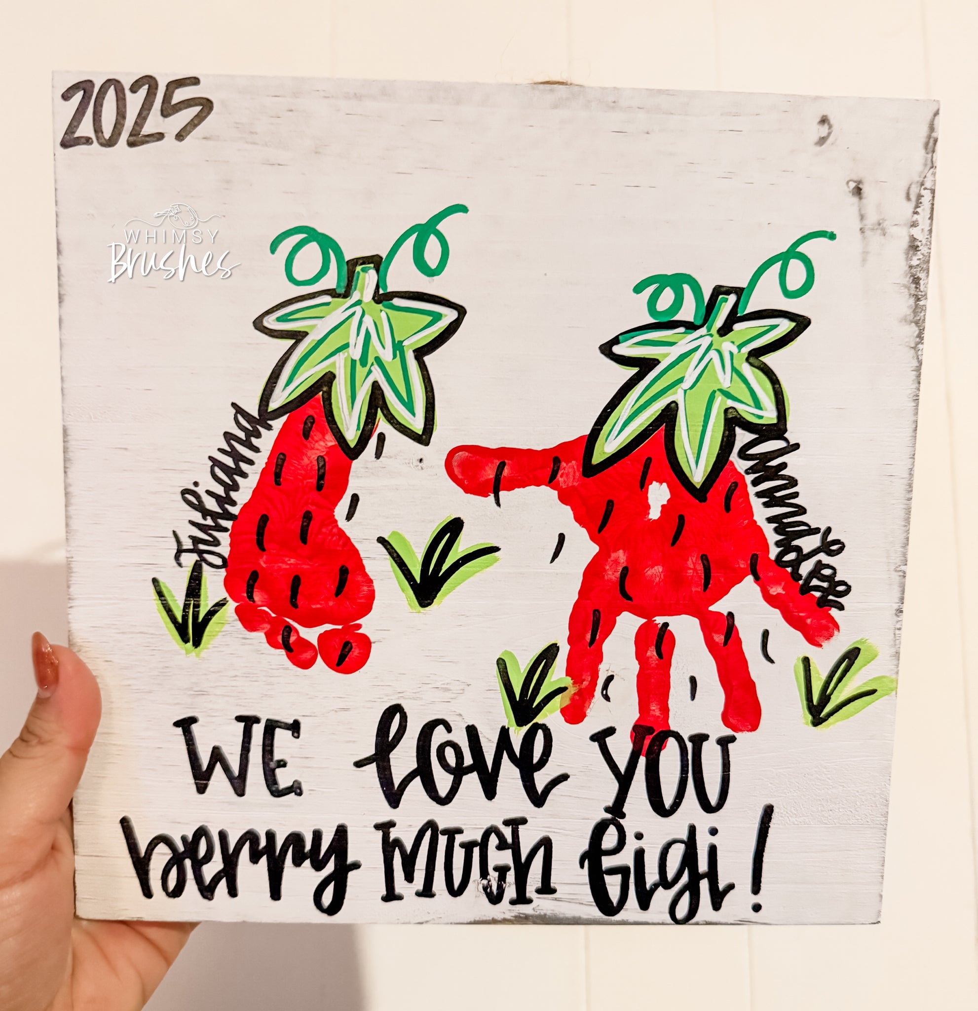 10x10 distressed wooden plaque can be propped on a shelf, hung with the twine hanger, OR sawtooth picture hanger. Multiple handprints/footprints can be added to 1 plaque.