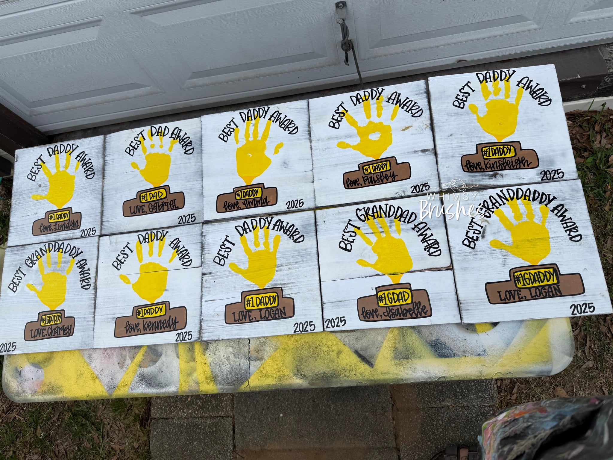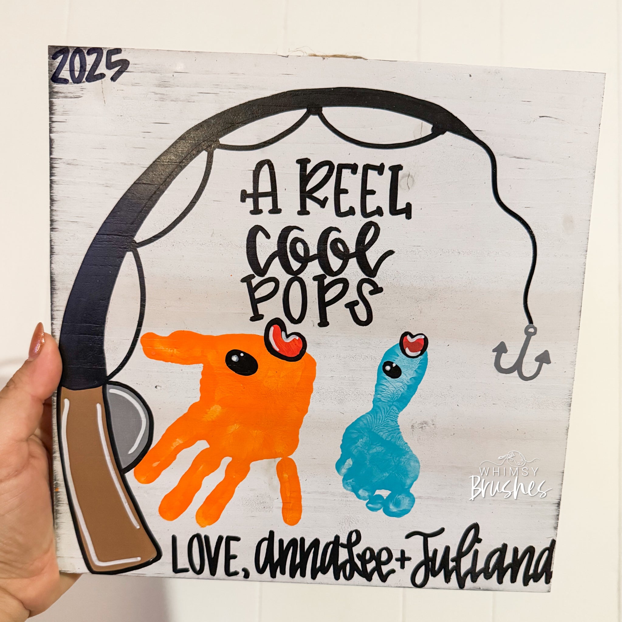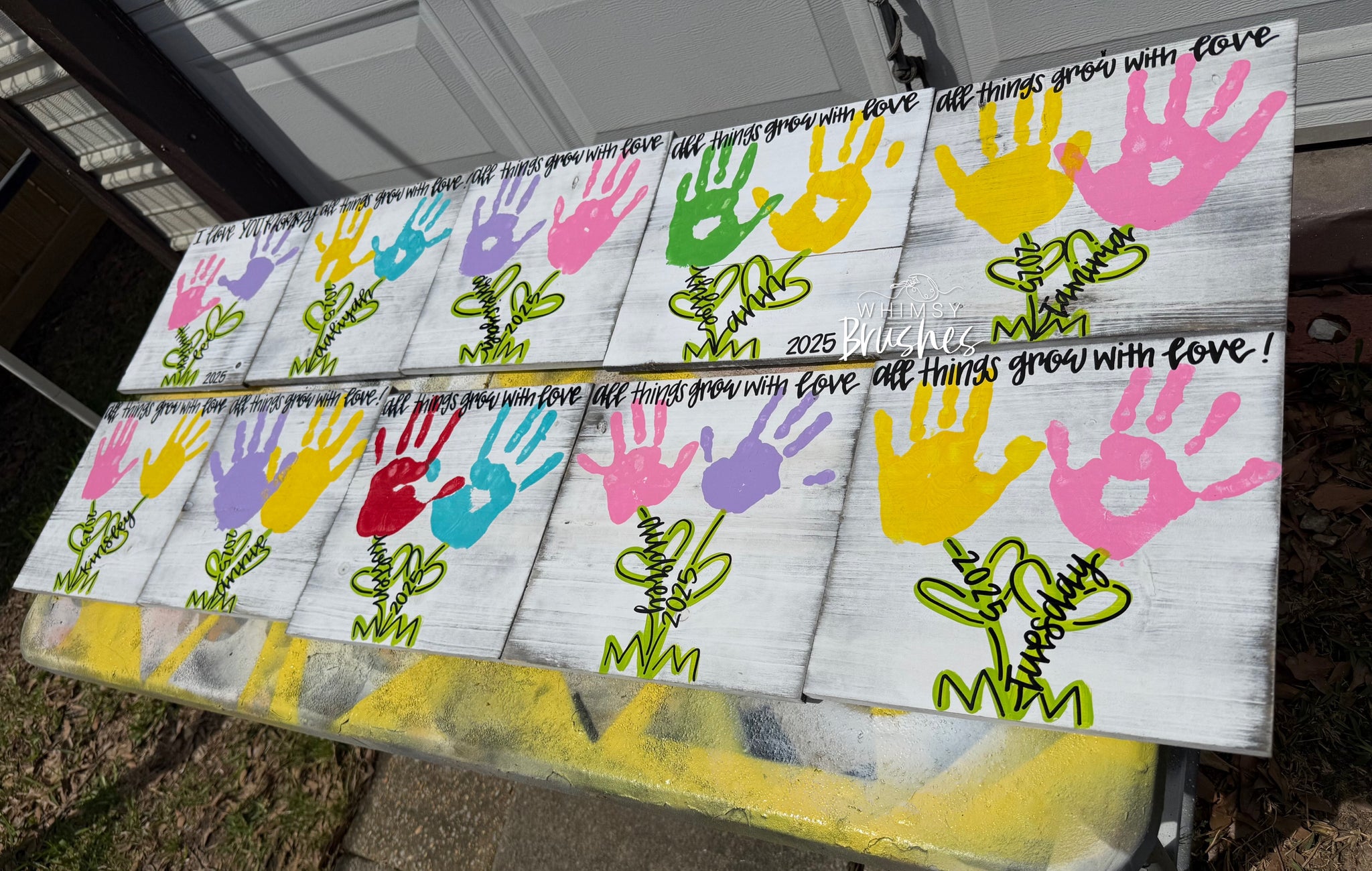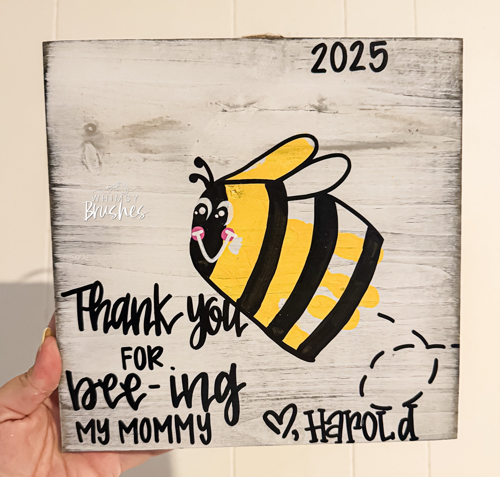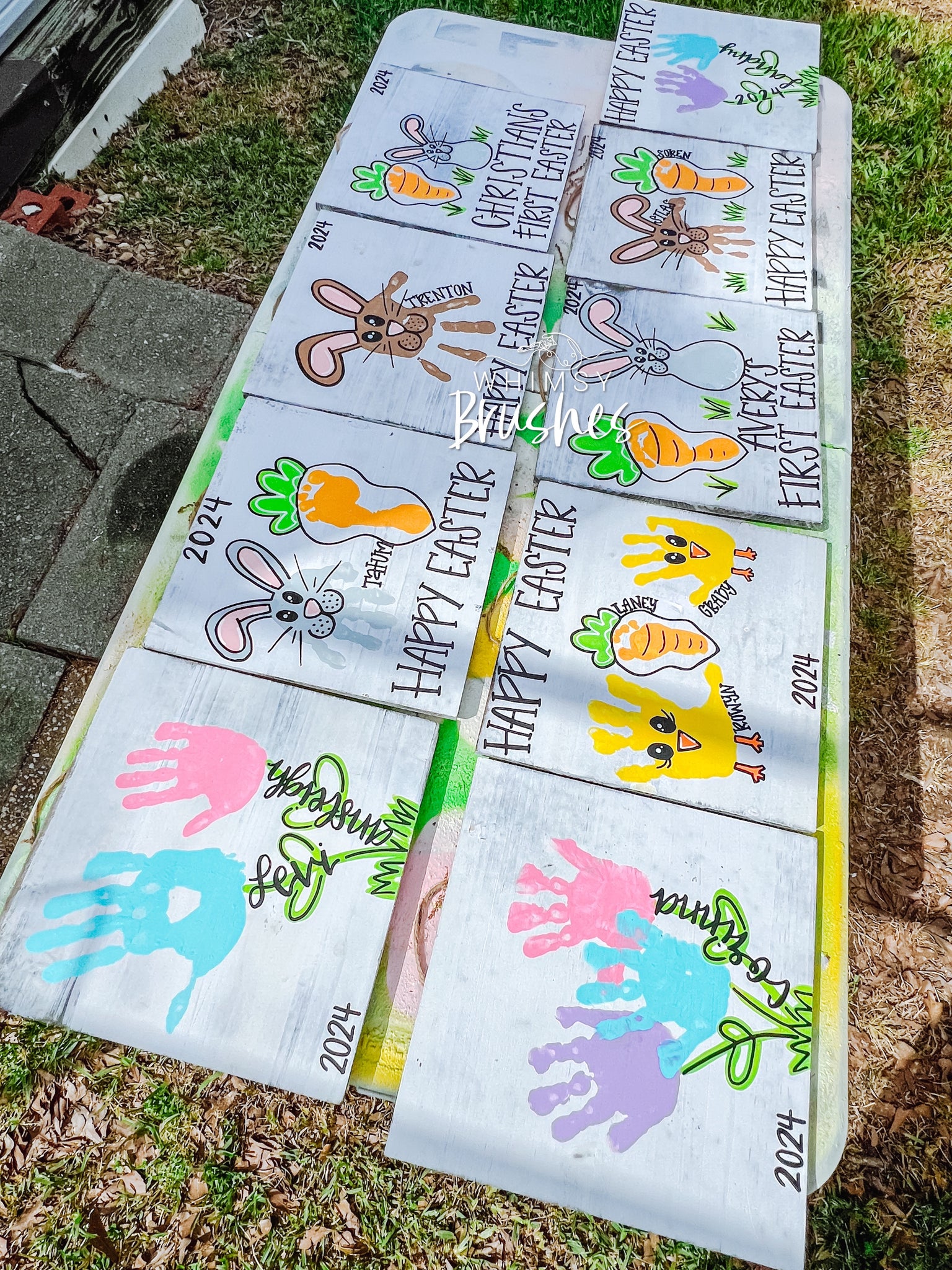 10x10 distressed wooden plaque can be propped on a shelf, hung with the twine hanger, OR sawtooth picture hanger. Multiple handprints/footprints can be added to 1 plaque.