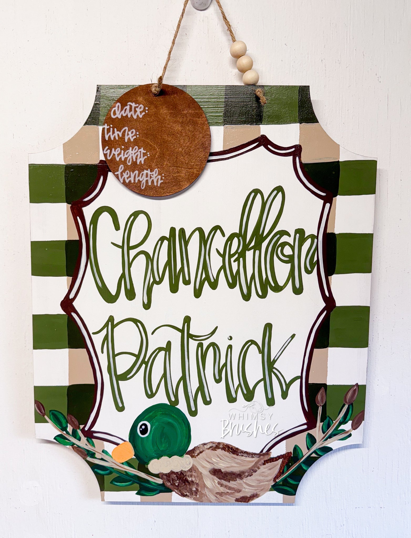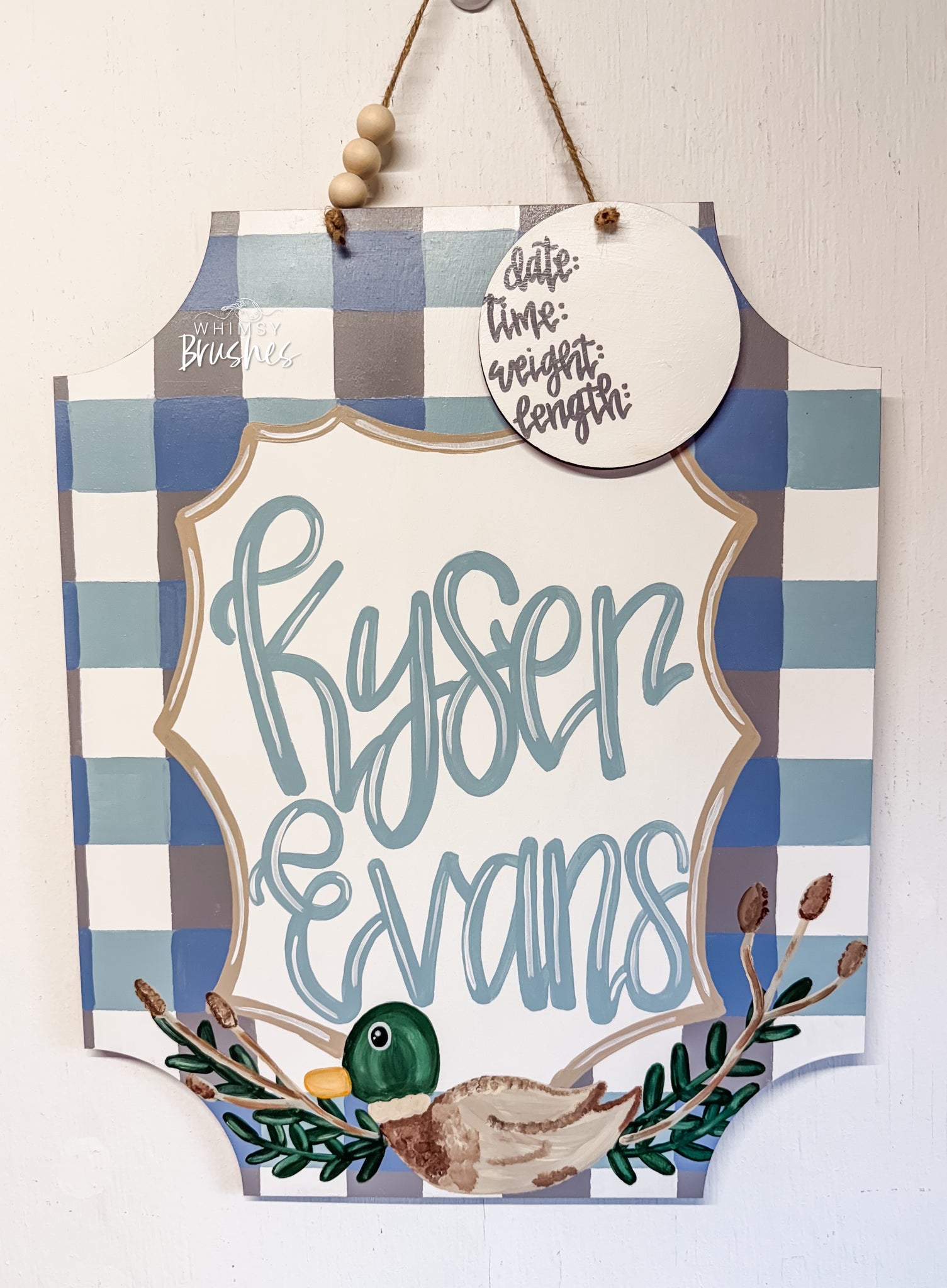 This wooden hand painted Blue Plaid Duck Plaque Baby Doorhanger is such an adorable hospital door hanger and makes a wonderful baby shower gift or a great addition to any nursery. This Doorhanger is 20” tall and 17” wide and includes a 5” stat card. This can be customized with any color scheme. Please include baby’s name and any detail in notes section at checkout. All signs are double coated with a sealant for protection from weather elements. If a bow is shown, materials may vary due to stock. Due to each piece being hand painted and an original, designs can vary in precise details, but overall the same design.