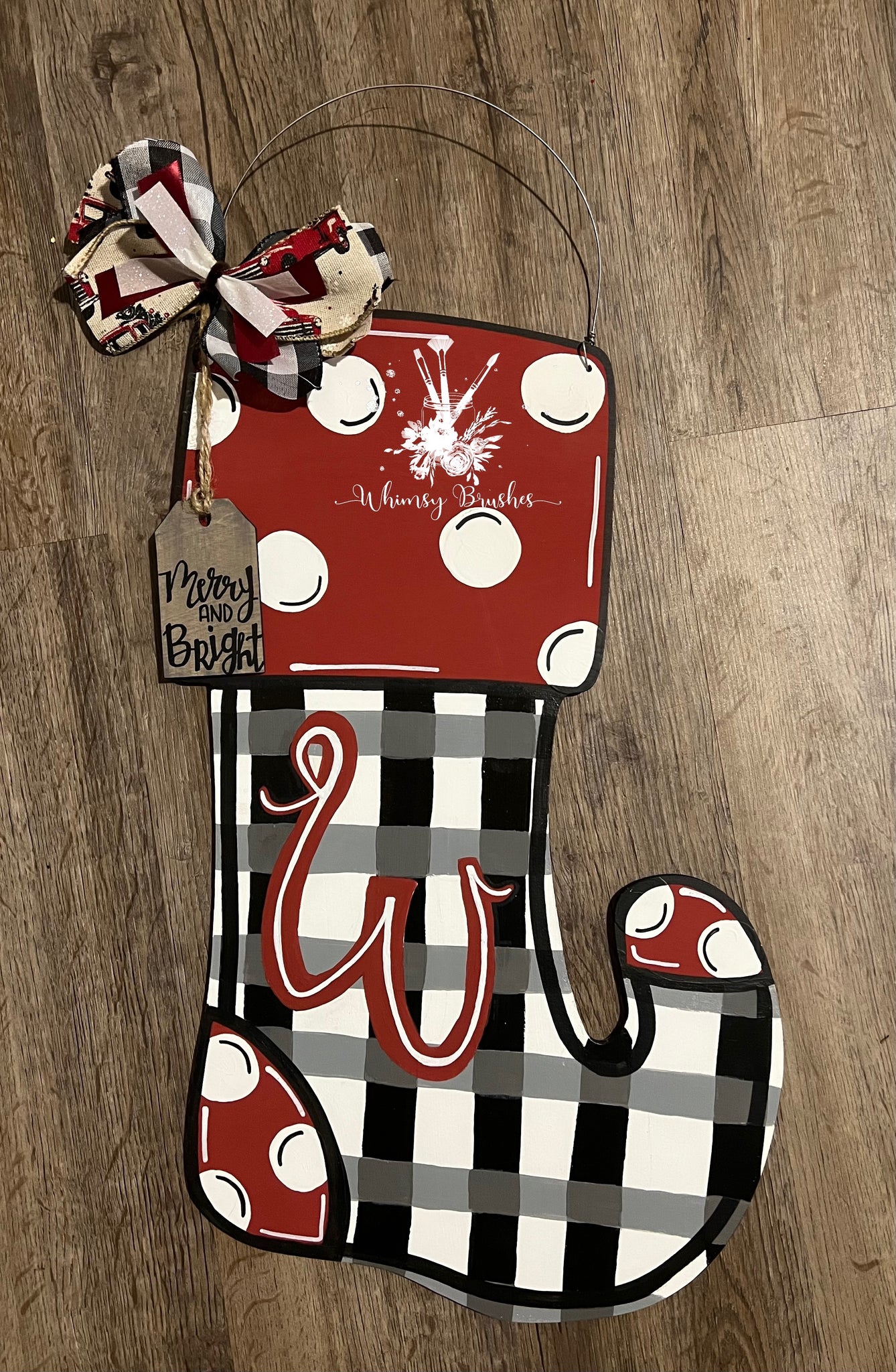 This hand painted Buffalo Plaid Stocking is the perfect farmhouse doorhanger for a Rustic Christmas look. It is 19” tall and 7” wide. Initial of last name can be added, include letter in notes section. All signs are double coated with a sealant for protection from weather elements. If a bow is shown, materials may vary due to stock. Due to each piece being hand painted and an original, designs can vary in precise details, but overall the same design.
