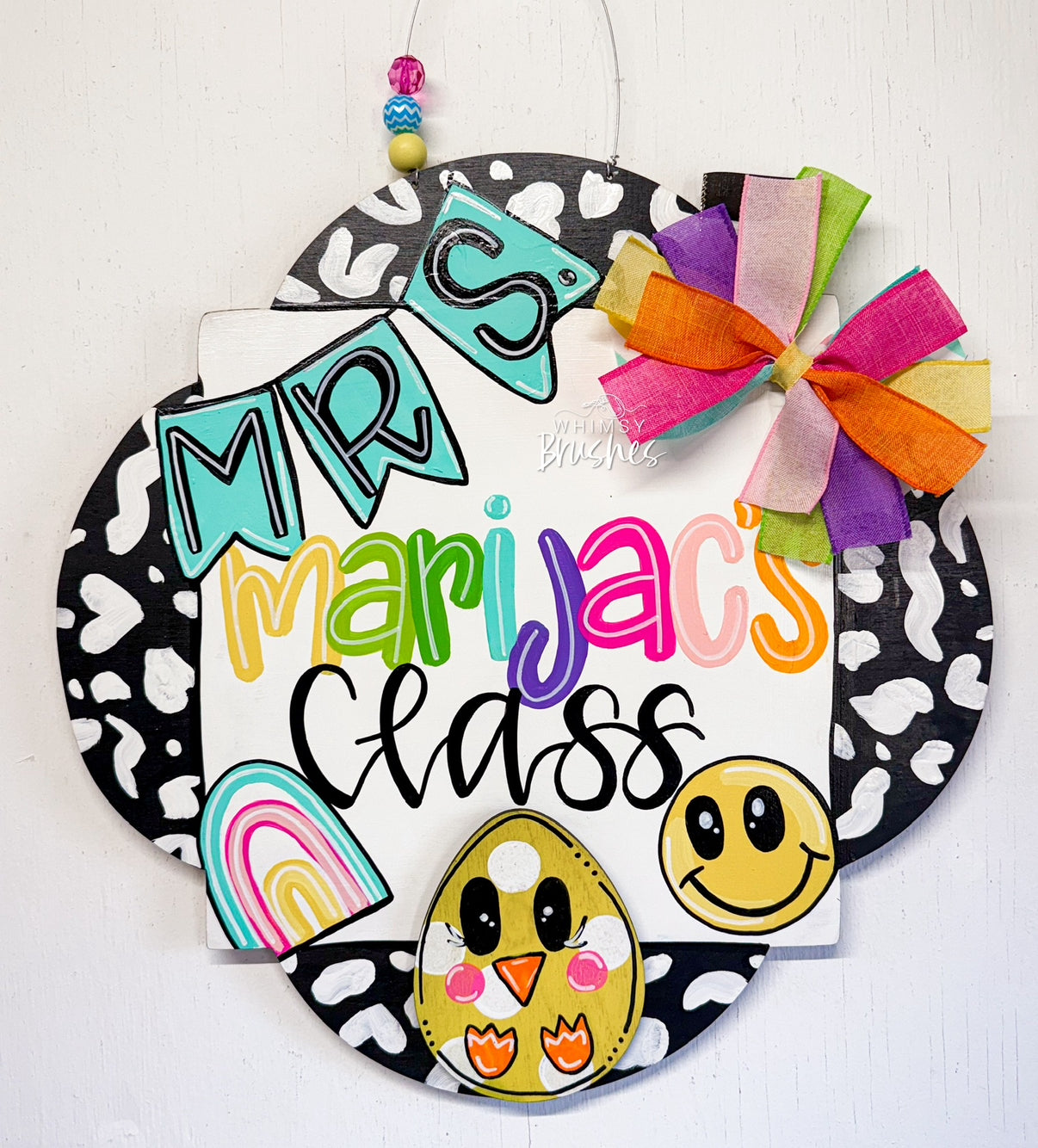 This wooden hand painted Colorful Composition Interchangeable Doorhanger is perfect for creating an inviting classroom that can be personalized with any name or saying. This Doorhanger is 18” tall and 17” wide. Please include name or saying in the custom notes section. This sign is interchangeable and used with interchangeable attachments. The attachment is not included and purchased separately. All signs are double coated with a sealant for protection from weather elements. If a bow and/or beads are shown, materials may vary due to stock. Due to each piece being hand painted and an original, designs can vary in precise details, but overall the same design.