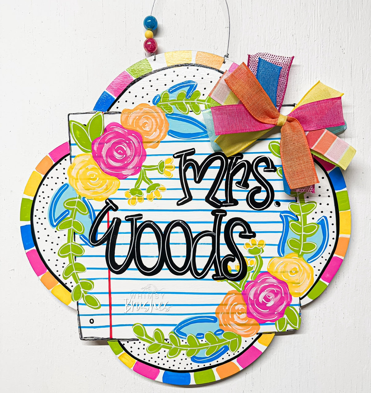 This hand painted Colorful Floral Notepad Doorhanger is perfect for creating an inviting classroom that can be personalized with any name or saying. Please be sure correct style is selected. Include name or saying in the notes section at checkout. This hangs at 18” tall and 17” wide. All signs are double coated with a sealant for protection from weather elements. If a bow and/or beads are shown, materials may vary due to stock. Due to each piece being hand painted and an original, designs can vary in precise details, but overall the same design.