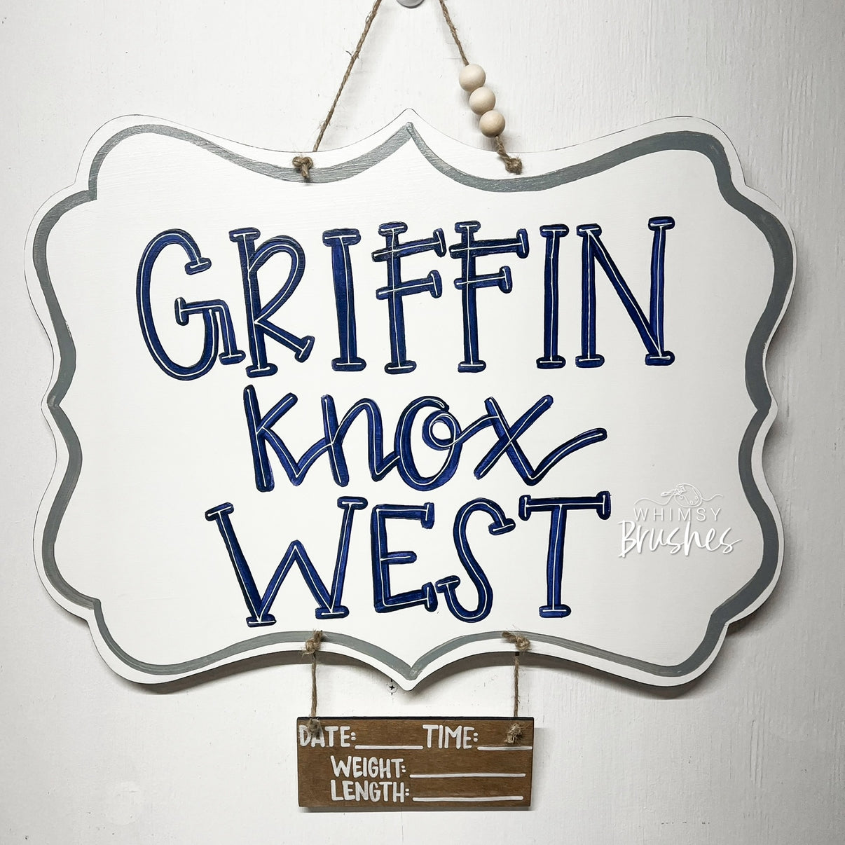 This wooden hand painted Full Name Quatre Le Foil Baby Doorhanger is such an adorable hospital door hanger and makes a wonderful baby shower gift or a great addition to any nursery. This Doorhanger is 15” tall and 19” wide and includes a 7” rectangle stat card. Make sure correct style is selected. This can be customized with any color scheme. Please include baby’s name and any detail in notes section at checkout. All signs are double coated with a sealant for protection from weather elements. If a bow is shown, materials may vary due to stock. Due to each piece being hand painted and an original, designs can vary in precise details, but overall the same design.