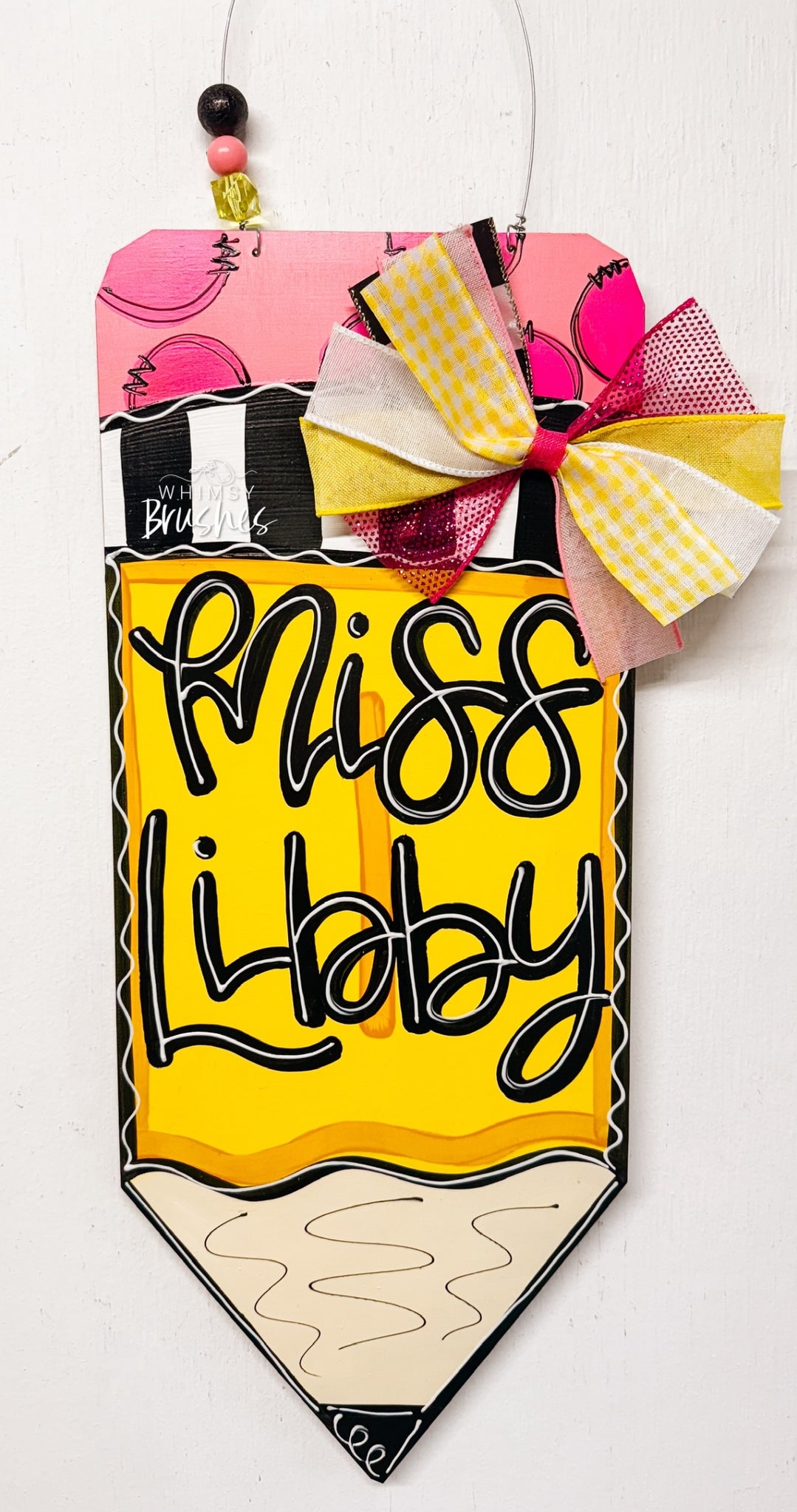 This hand painted Pencil Doorhanger is perfect for creating an inviting classroom that can be personalized with any name or saying. Please be sure correct style is selected. Include name or saying in the notes section at checkout. These hang 19” tall and 9.5” wide. All signs are double coated with a sealant for protection from weather elements. If a bow and/or beads are shown, materials may vary due to stock. Due to each piece being hand painted and an original, designs can vary in precise details, but overall the same design.
