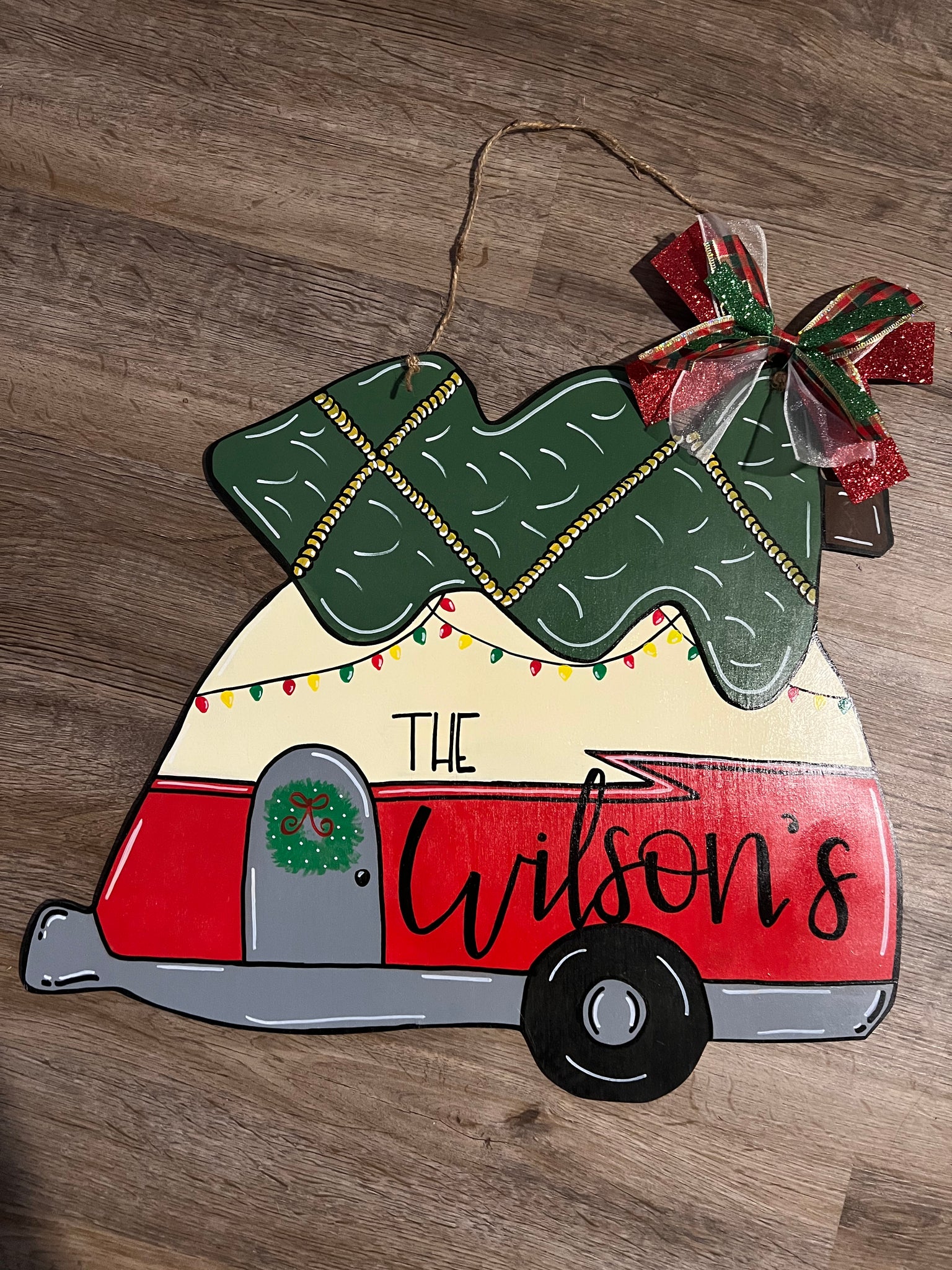 This hand painted Merry Camper doorhanger is the perfect merry to your Christmas. It is 20” tall and 17” wide. This sign can be customized with a last name or “Merry Camper” saying, please leave name or saying in notes section. All signs are double coated with a sealant for protection from weather elements. If a bow is shown, materials may vary due to stock. Due to each piece being hand painted and an original, designs can vary in precise details, but overall the same design.