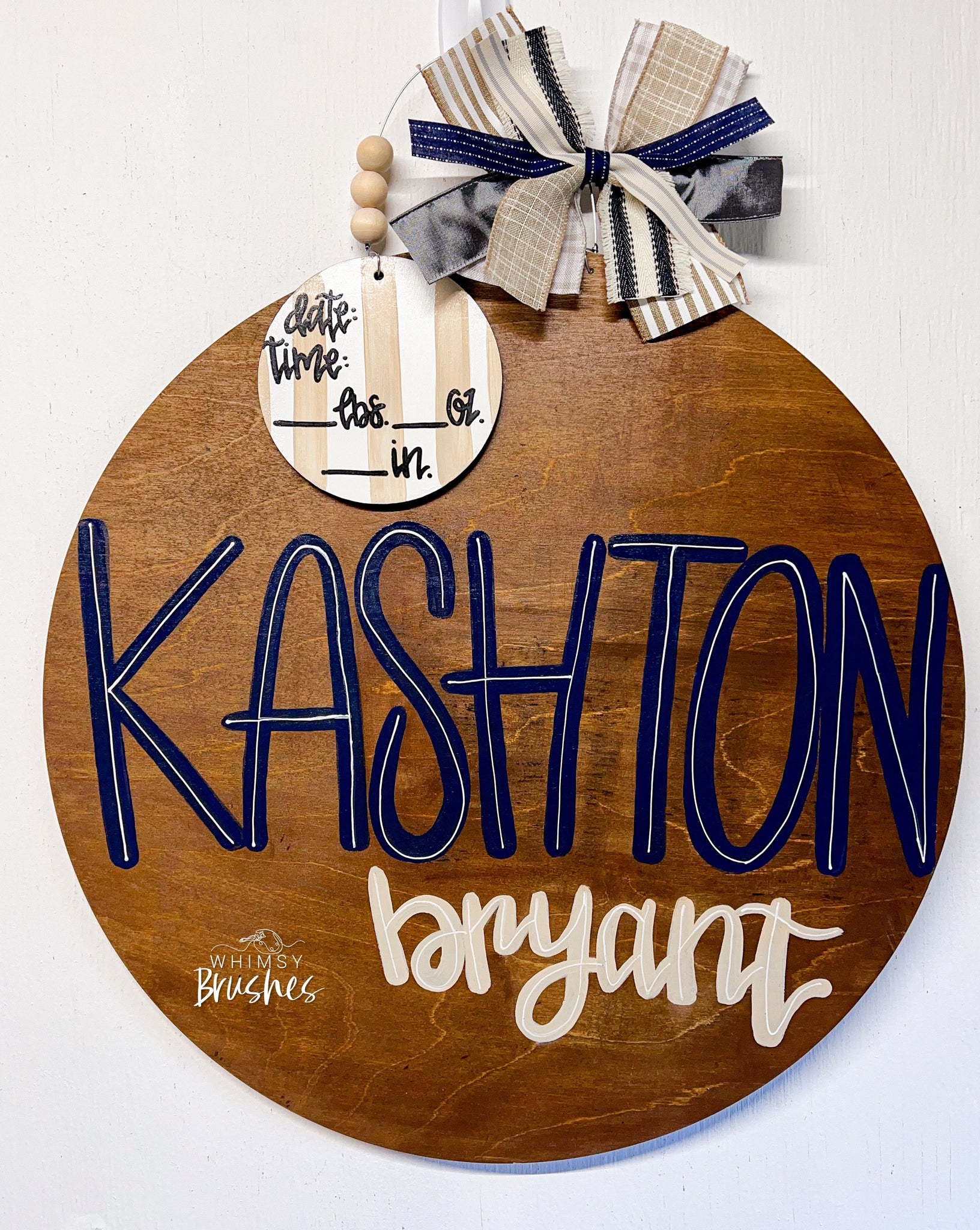 This wooden hand painted Navy and Neutral Round Baby Doorhanger is such an adorable hospital door hanger and makes a wonderful baby shower gift or a great addition to any nursery. This Doorhanger comes in two sizes: 15” and 19 and includes a 5” stat board. Please make sure correct size of round is selected. This can be customized with any color scheme. Please include baby’s name and any detail in notes section at checkout. All signs are double coated with a sealant for protection from weather elements. If a bow is shown, materials may vary due to stock. Due to each piece being hand painted and an original, designs can vary in precise details, but overall the same design.