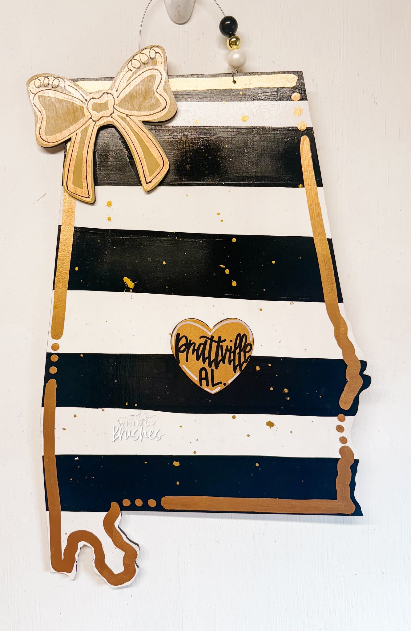 This hand painted Preppy Striped State Doorhanger can be used year round or everyday. This Doorhanger is 20” tall and 16” wide. A raised 3” heart is attached to the hanger in the area of your hometown. Any custom town or family name can be painted on the heart, be sure to include details in the customization box. New States can be requested as well. All signs are double coated with a sealant for protection from weather elements. If a bow is shown, materials may vary due to stock. Due to each piece being hand painted and an original, designs can vary in precise details including the bows and greenery, but overall the same design.