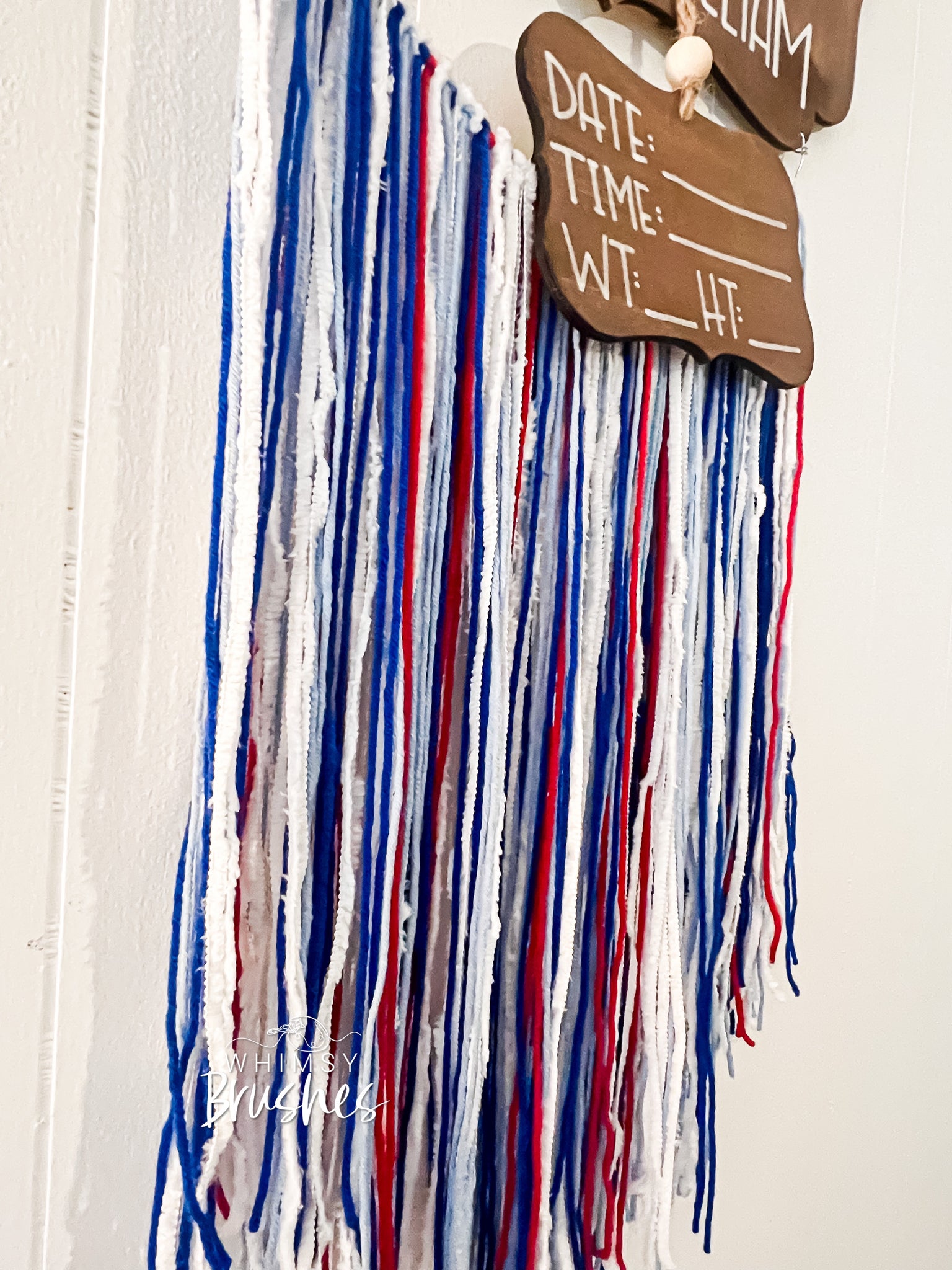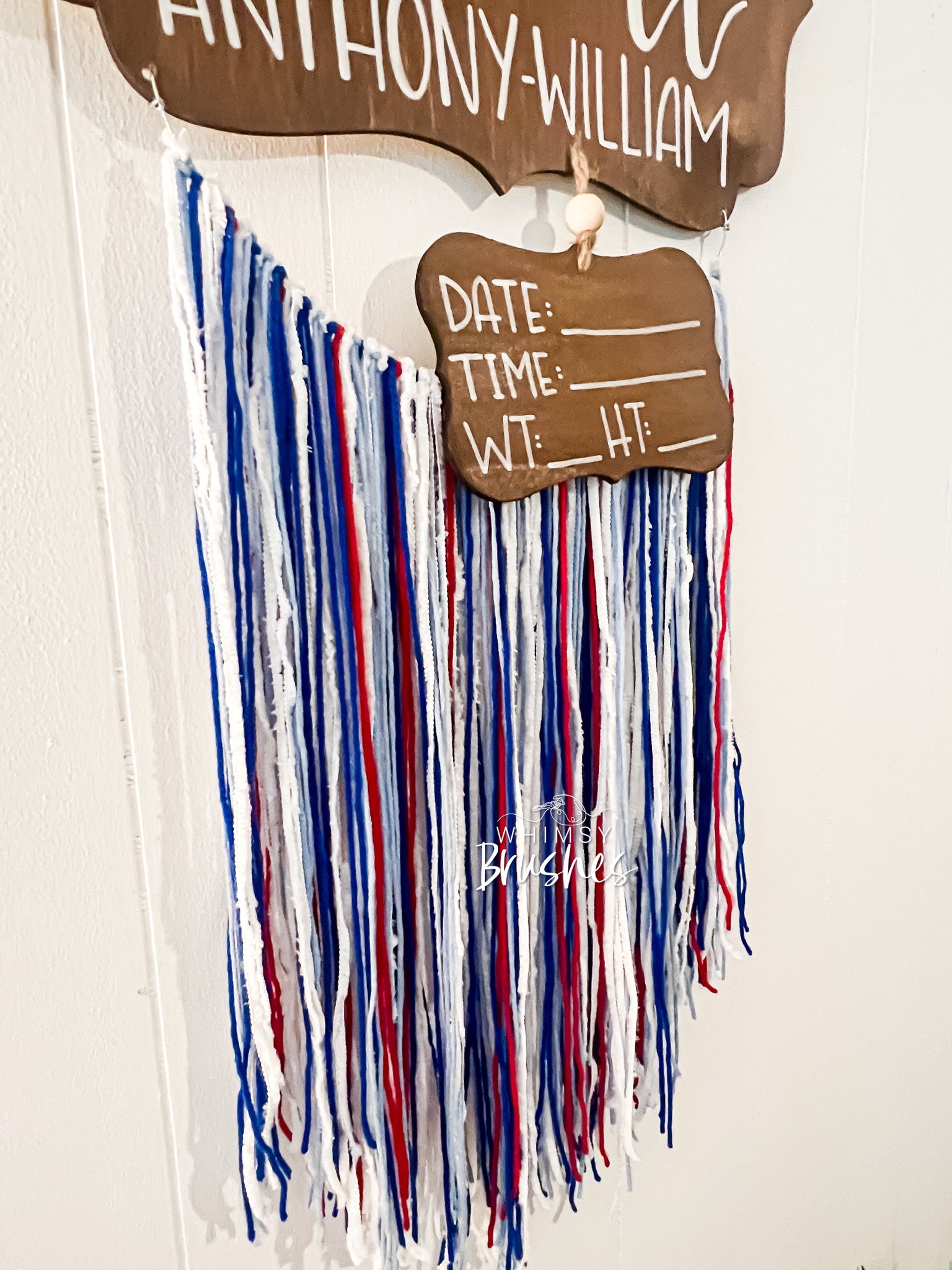 This wooden hand painted Quatre Le Foil Macrame Baby Doorhanger is such an adorable hospital door hanger and makes a wonderful baby shower gift or a great addition to any nursery. The Doorhanger board is 19” long and 11” tall includes a 5” stat board. The macrame is roughy 12” long, making the entire Doorhanger hand at 2 foot long. This can be customized with any color scheme. Please include baby’s name and any detail in notes section at checkout. All signs are double coated with a sealant for protection from weather elements. If a bow is shown, materials may vary due to stock. Due to each piece being hand painted and an original, designs can vary in precise details, but overall the same design.