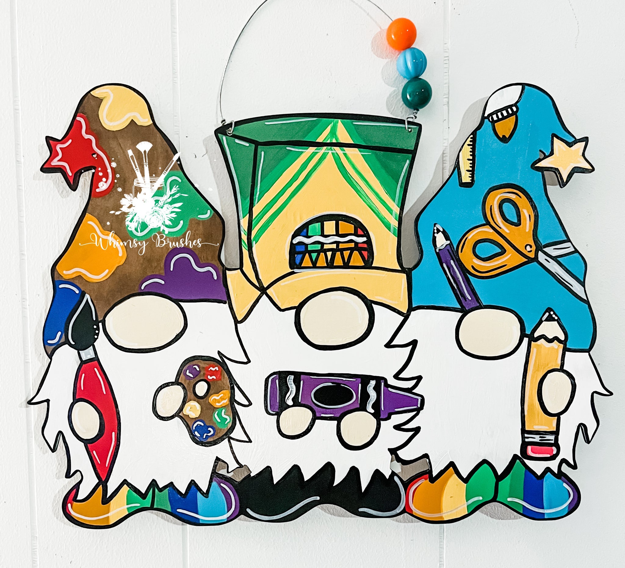 This hand painted Teacher Gnome Trio Doorhanger is perfect for creating an inviting classroom that can be personalized with any name or saying. This Doorhanger is 15” wide and 11” tall. All signs are double coated with a sealant for protection from weather elements. If a bow and/or beads are shown, materials may vary due to stock. Due to each piece being hand painted and an original, designs can vary in precise details, but overall the same design.