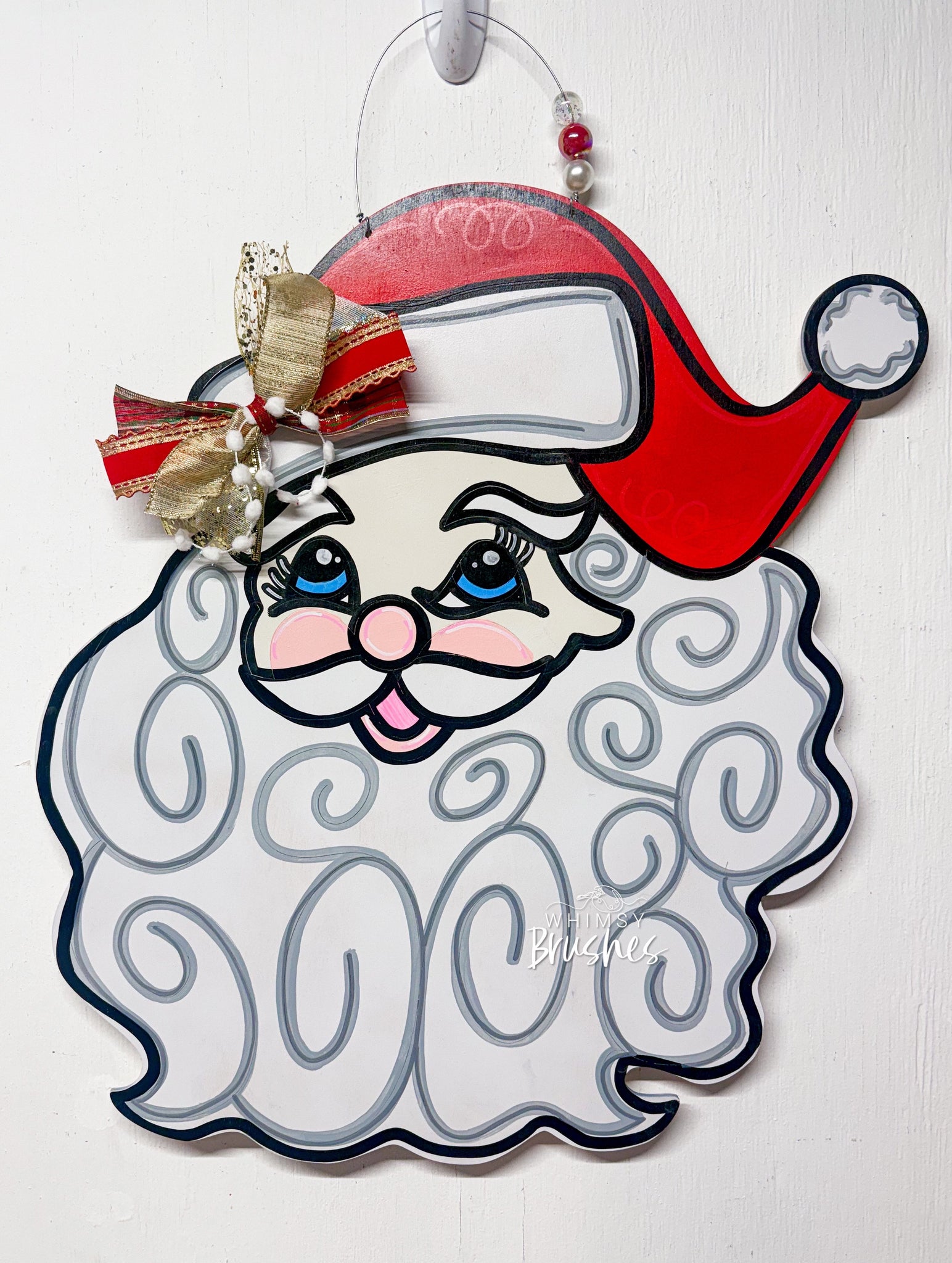This wooden hand painted Vintage Whimsical Santa doorhanger is the perfect merry to your Christmas. It is 22” tall and 21” wide. This door hanger comes in 2 different colors red or pink. Be sure the correct color wanted is selected. All signs are double coated with a sealant for protection from weather elements. If a bow is shown, materials may vary due to stock. Due to each piece being hand painted and an original, designs can vary in precise details, but overall the same design.